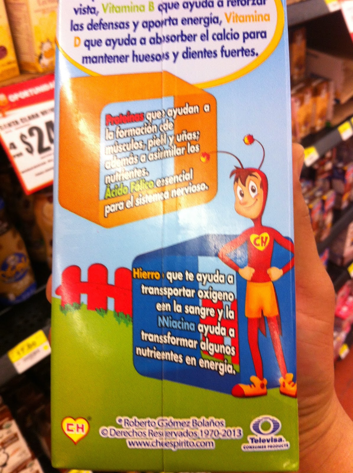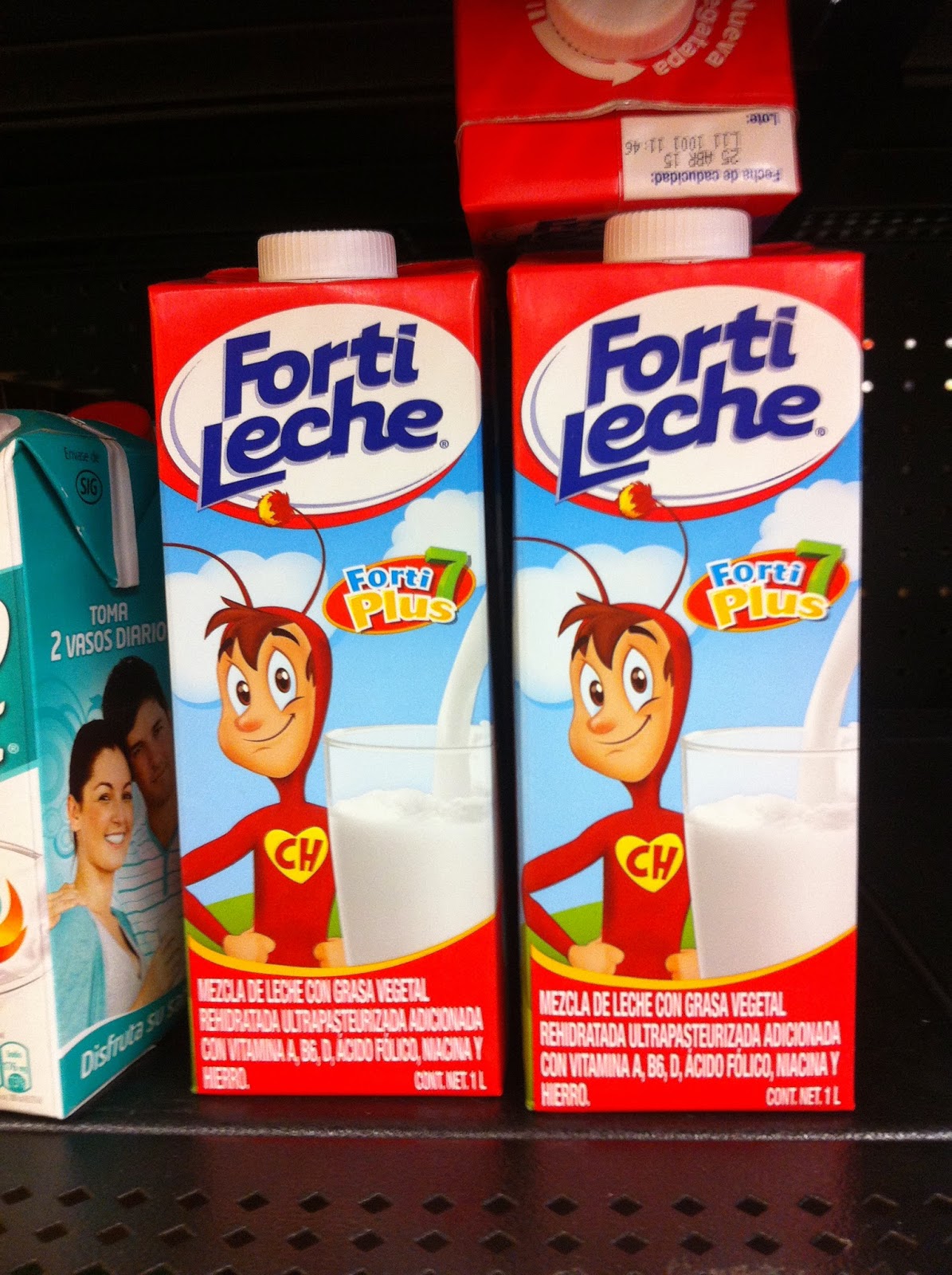 Dentro del mismo anaquel, en una versión de litro, se encuentra una leche denominada Fortileche que ostenta lo que extrañamente es una licencia oficial del Chapulín Colorado (concedida a través de su representante Televisa) Y hago hincapié en el tema de la oficialidad, ya que el personaje en el empaque no parece haber tenido aún un tratamiento gráfico profesional por parte de quien lo maneja, ya que no parecen existir ninguna clase de elementos o arte que lo haga atractivo o que se alinee de alguna manera con el arte existente del Chavo Animado, cosa que personalmente me llama mucho la atención.