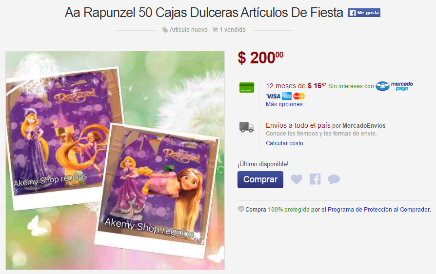 Y bueno, en el caso de los maletines, alcancías o las bolsitas de esta persona, me vinieron a la cabeza 10 licenciatarios distintos que pudieran estar haciendo algo similar, los Googlee y no me parece que ninguno esté haciendo en este momento artículos de Rapunzel como los que se requieren, pero también en los resultados de la búsqueda me encontré al clásico vivales de Mercado Libre, que ante la demanda tiene su propia oferta… El personaje que quieras, personalizado, 20 pesos por cajita… ¿Qué habrá pasado con esta persona? ¿Habrá cambiado la fiesta temática de su hija por lo que estuviera ahorita en el mercado? O ¿Habrá encontrado a esta persona en Mercado Libre y hecho su apócrifa compra?